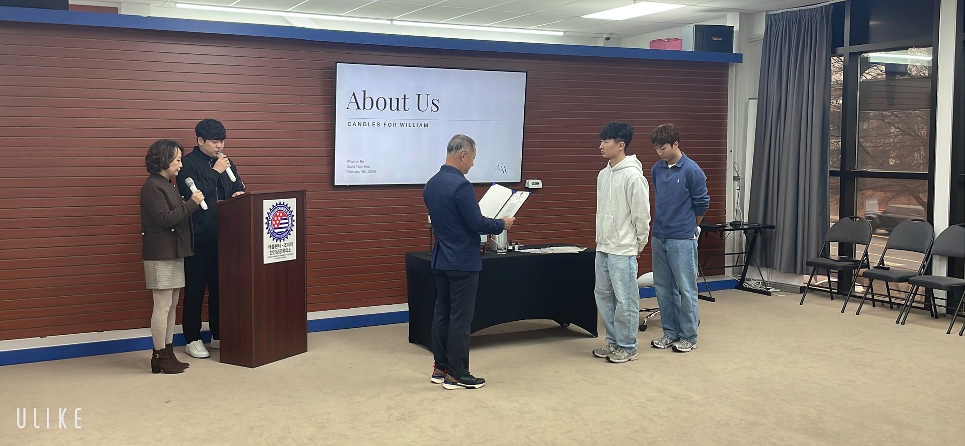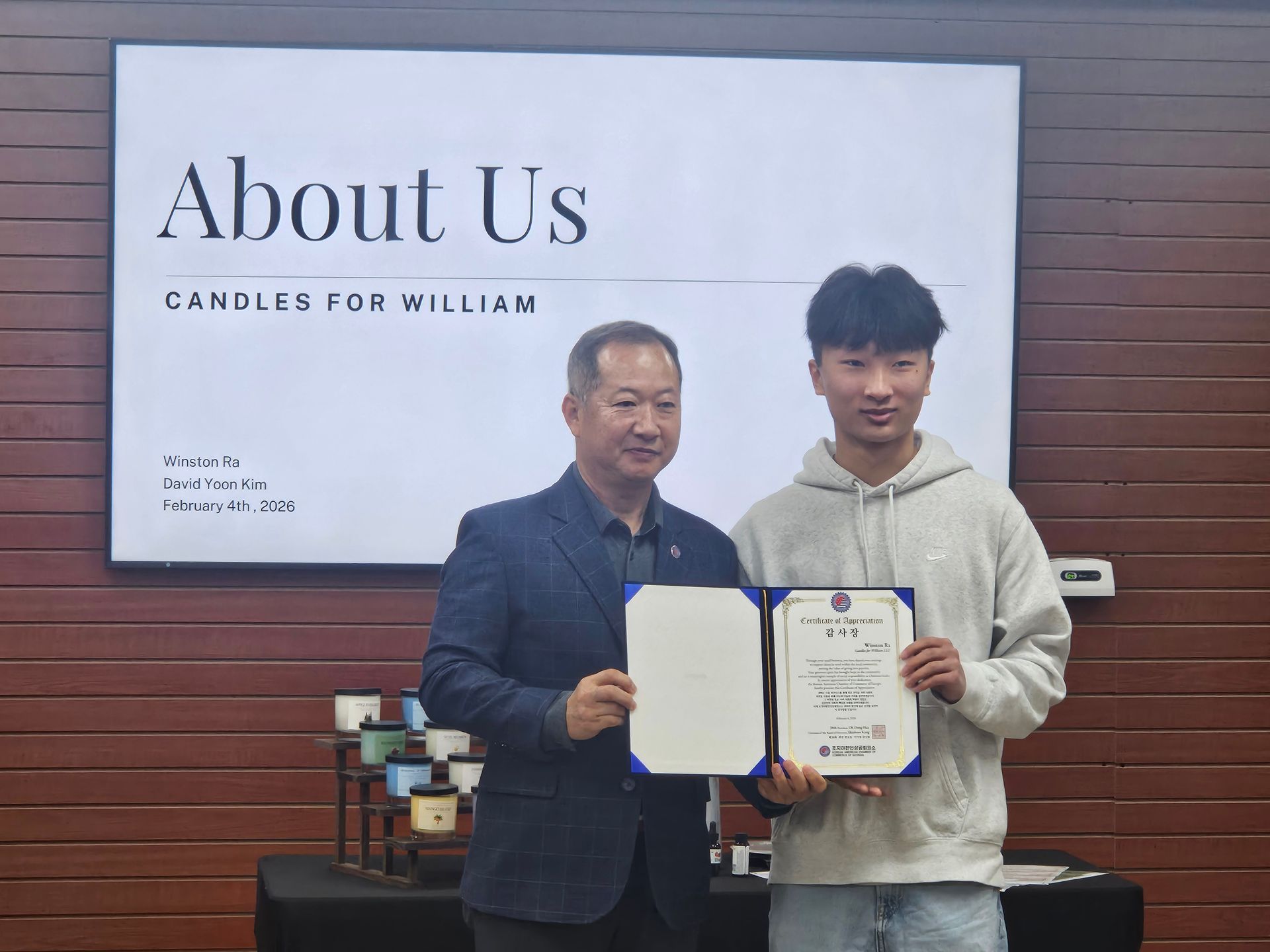 조지아한인상공회의소 Candles for William 감사장 전달식 1만명 중 1명 발견된다는 희귀 증후군 William Syndrome 동생이 있는 Winston Ra 군은 그의 친구 David Yoon 군과 함께 2024년 Candles for William 을 창업하였습니다. 현재 Chatahoochee High-school 에 재학중인 두 창업주는 수익의 일부를 William Syndrome 등 희귀병을 앓고 있는 분들을 돕는데 기부하는 선행을 하고 있으며, WSB Action News 에 소개되기도 하였습니다. 한인의 위상을 높이는데 기여한 자랑스런 청년들에, 조지아한인상공회의소에서 감사장 및 성금을 전달하는 행사를 진행할 예정이오니 많은 참석 부탁 드립니다. ▣ 기자회견 개요 • 일시: 2026년 2월 4일(수) 오전 11시 • 장소: 둘루스 콜핑(Kolping) 2층 • 내용: 감사장 및 성금 전달식 Name: Winston Ra Name: David Y 관련기사: https://speculatorvision.wordpress.com/2024/09/11/you-cant-hold-a-candle-to-them-candles-for-william/ https://www.wsbtv.com/news/local/fulton-county/johns-creek-teen-raises-awareness-children-with-disabilities-one-candle-time/HRL4OHQW6BGUZNUKGUGYB7YVYI/
